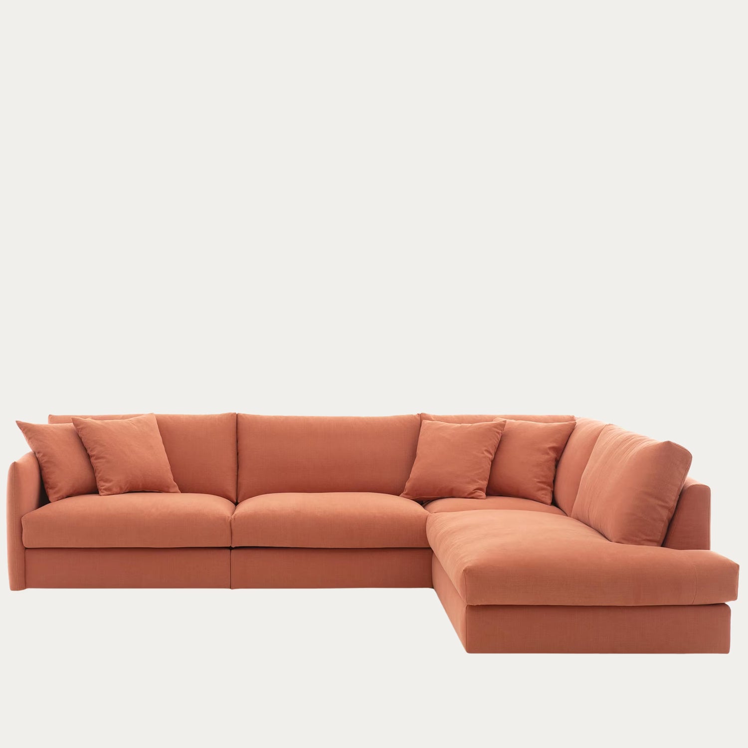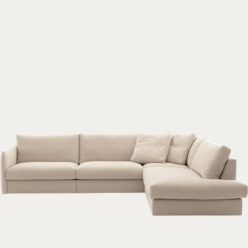 Beigen sävyinen Basel avokulmasohva on saatavilla joko oikea- tai vasenkätisenä istuinratkaisuna, tarjoten mukavuutta ja väljyyttä olohuoneeseen.