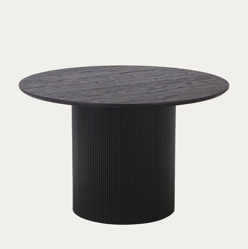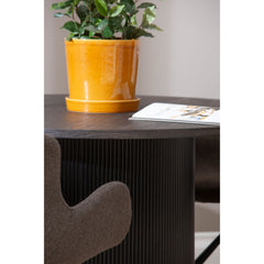 Pöydän erottuva, uritettu jalusta antaa kokonaisuudelle persoonallista ilmettä, ja syvän tumma sävy tuo ripauksen ylellisyyttä niin moderniin kuin klassisempaan sisustukseen. Laadukkaat materiaalit ja huolellinen viimeistely takaavat, että pöytä kestää aikaa ja käyttöä.