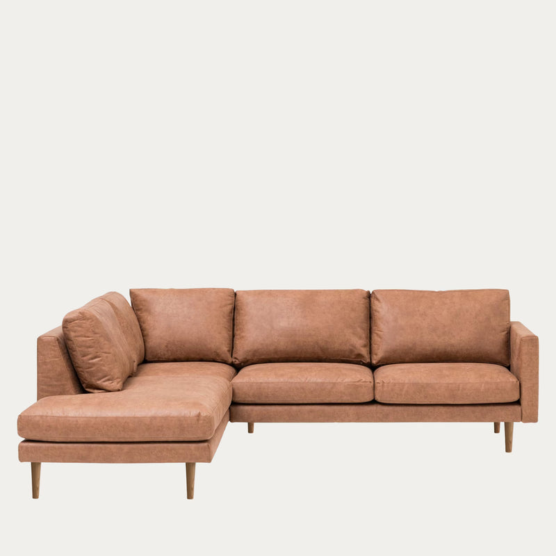Copenhagen avokulmasohva on konjakinvärinen, tyylikäs ja ajaton kaluste, jonka pintamateriaalina on kestävä bonded-nahka. Tämä väri tuo lämpöä ja kodikasta tunnelmaa olohuoneeseesi.