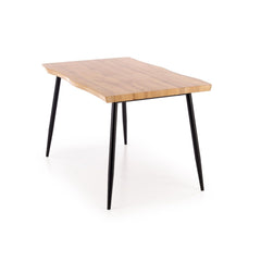 Luonnonläheistä tyyliä ja modernia keveyttä – tämä ruokaryhmä yhdistää upeasti lämpimän puupinnan, kevyet metallirakenteet ja miellyttävän istumamukavuuden. Epäsymmetrisesti muotoiltu pöydänkansi tuo kokonaisuuteen orgaanista ilmettä ja tekee jokaisesta ruokailuhetkestä erityisen. Mustat metallijalat tuovat ryhtiä ja kestävyyttä, kun taas tuolien pehmustetut istuimet ja kaarevat puuselkänojat tarjoavat miellyttävän istuma-asennon.