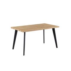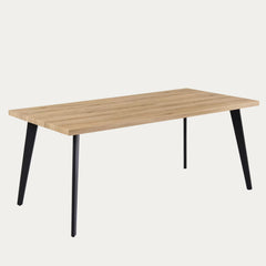East-ruokapöytä on täydellinen valinta, kun haluat yhdistää modernin muotoilun ja kestävän rakenteen. Luonnollisen puunsävyinen MDF-pöytätaso tuo lämpöä sisustukseen, ja mustat viistot metallijalat lisäävät pöydän tukevuutta sekä teollista ilmettä.