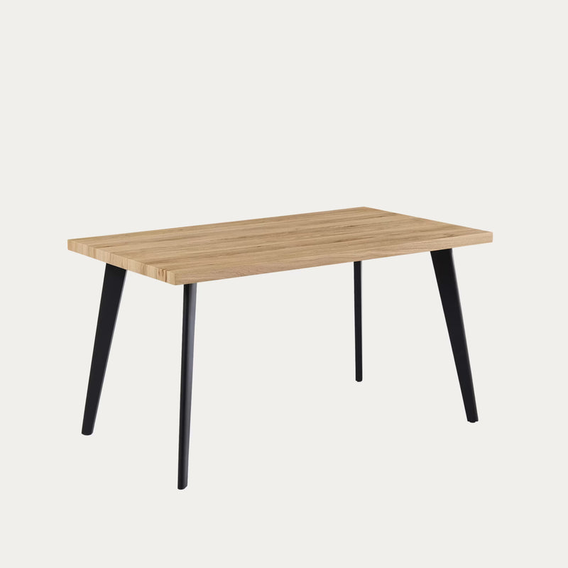 East-ruokapöytä on täydellinen valinta, kun haluat yhdistää modernin muotoilun ja kestävän rakenteen. Luonnollisen puunsävyinen MDF-pöytätaso tuo lämpöä sisustukseen, ja mustat viistot metallijalat lisäävät pöydän tukevuutta sekä teollista ilmettä.