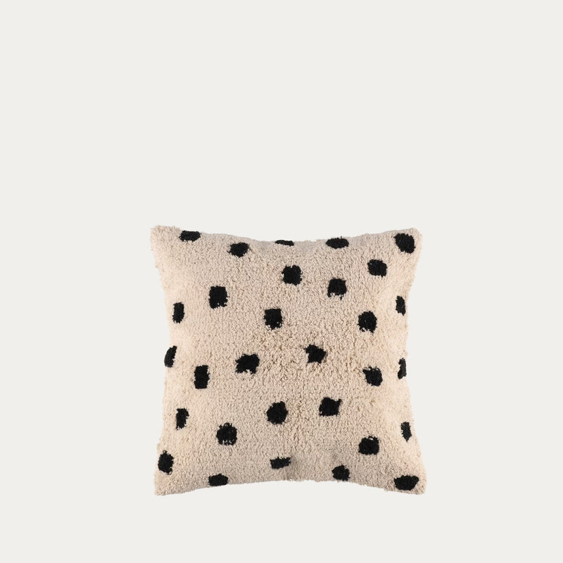 Tuftattu Fanni K Spot koristetyyny pilkkukuviolla. Toinen puoli sileää yksiväristä puuvillakanvaasia. Irrotettava päällinen. Koko 50 x 50 cm. Materiaali 100 % puuvilla, täyte polyesteri. Käsinpesu.