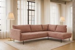 Tämä avokulmasohva on verhoiltu lämpimän vaaleanpunaisella kankaalla, mikä luo pehmeän ja kutsuvan ilmeen. Sohvan jalat ovat mustat ja ohuet, mikä lisää modernia ilmettä ja keveyttä kokonaisuuteen.