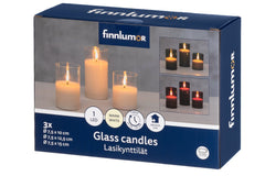 Finnlumorin lasikynttilät tarjoavat kolmen kynttilän setin, jossa lämpimän valkoinen LED-valo luo aitoa kynttilän tunnelmaa turvallisesti. Lasiset kupit antavat kynttilöille kauniin ja modernin ilmeen, jota voi käyttää sisätiloissa luomassa pehmeää valoa.