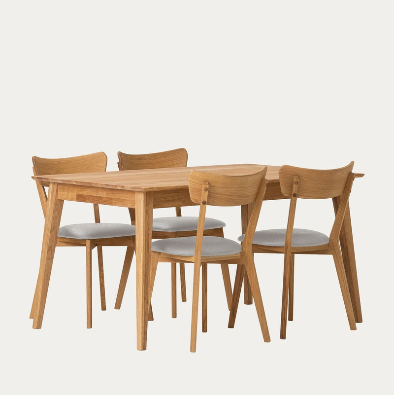 Luo ruokailutila, jossa tyyli ja käytännöllisyys kulkevat käsi kädessä. Tämä laadukkaasta tammesta valmistettu ruokaryhmä huokuu skandinaavista eleganssia ja kestävyyttä. Settiin kuuluu neljä ergonomisesti muotoiltua tuolia sekä tukeva, sirolinjainen ruokapöytä – täydellinen valinta niin arjen aterioihin kuin juhlahetkiinkin.