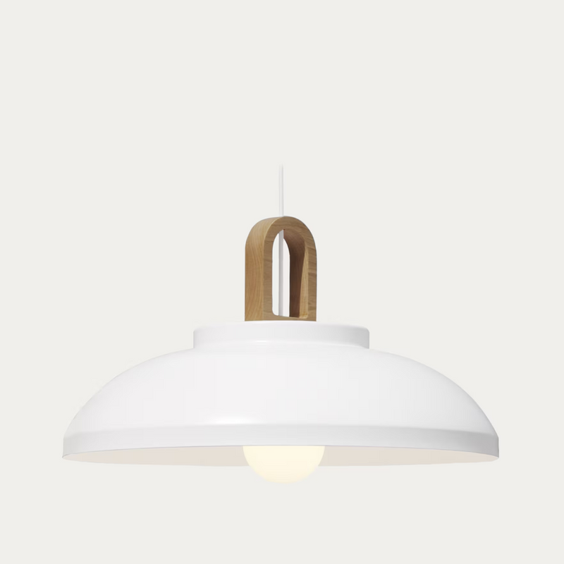 Leone 50 -kattovalisin tuo valoa ja selkeää muotoilua tilaan. Valaisin on valkoinen, ja sen yläosassa on tyylikäs tammen sävyinen yksityiskohta, joka tuo lämpöä ilmeeseen.