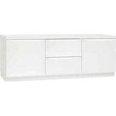 Tämä selkeälinjainen tv-taso yhdistää käytännöllisyyden ja modernin muotoilun tyylikkäästi. Kaksi tilavaa kaappia ja keskellä sijaitsevat vetimettömät laatikot tarjoavat runsaasti säilytystilaa niin medialaitteille, johdoille kuin muille kodin tarvikkeille.
