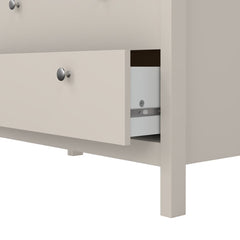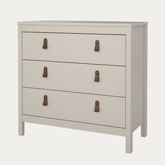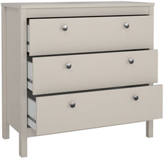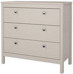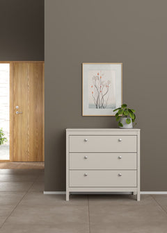 Madrid-lipasto on kashmirin harmahtava vaalea beige (greige), joka sopii monenlaisiin sisustuksiin. Lipastossa on kolme laatikkoa, jotka tarjoavat runsaasti tilaa esimerkiksi vaatteille, asusteille tai muille arjen tavaroille.