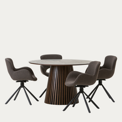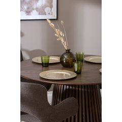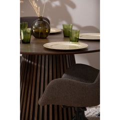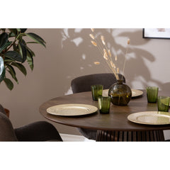 Tämä upea pyöreä ruokapöytä on suunniteltu huolella, ja sen vaikuttava, uurrettu jalka muistuttaa taidokkaasti sormipaneelia. Pöydän jykevä rakenne ja kauniit yksityiskohdat tekevät siitä ihanteellisen keskipisteen niin arkeen kuin juhlaan.