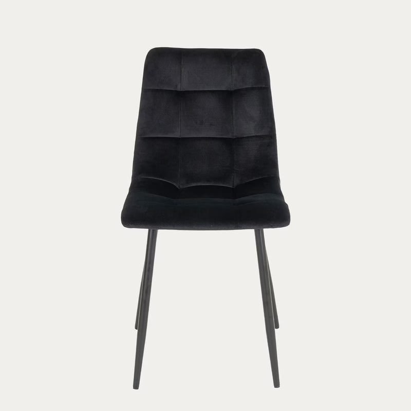 Tuo ripaus luksusta ruokailutilaasi tällä modernilla ja tyylikkäällä ruokatuolilla! Pehmeä samettimainen kangasverhoilu luo ylellisen ilmeen ja tuntuman, kun taas kevyesti topattu istuin ja selkänoja tarjoavat erinomaisen istumamukavuuden. Hillityn musta sävy yhdistettynä siroihin metallijalkoihin tekee tuolista täydellisen valinnan niin moderniin kuin klassiseenkin sisustukseen.