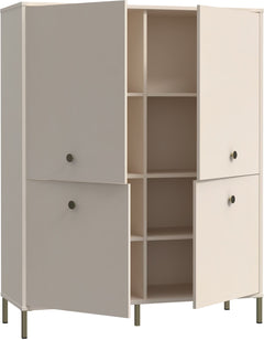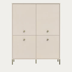 Minea-kappi hiekansävyisenä tarjoaa hillityn ja raikkaan säilytysratkaisun neljällä ovella ja metallisilla jaloilla. Tilaa löytyy arkeen tai toimistoon.