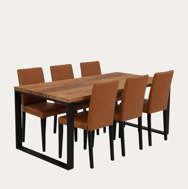 Tämä näyttävä ruokaryhmä tuo ruokailutilaasi rouheaa luonnonläheisyyttä ja ajatonta laatua. Massiivipuusta valmistettu lankkupöytä hurmaa jykevällä olemuksellaan ja eläväisellä puupinnallaan, jossa jokainen yksityiskohta kertoo luonnon ainutlaatuisuudesta. Mustat metallijalat tuovat kokonaisuuteen modernin, teollishenkisen vivahteen.