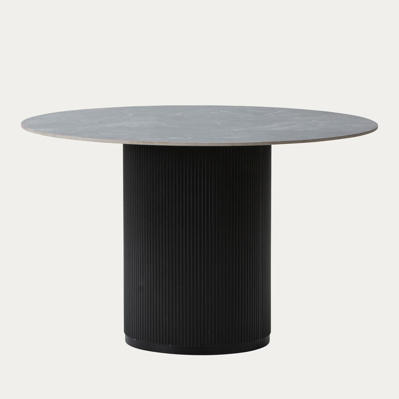 North collection Kalida ruokapöytä on moderni ja selkeälinjainen kaluste, jossa on pyöreä musta pöytälevy keramiikalla viimeisteltynä. Sen muotoilu tuo tilaan ajattoman ja rauhallisen ilmeen, joka toimii monenlaisissa sisustuksissa.