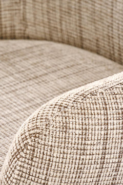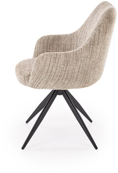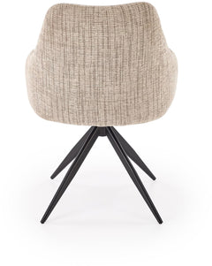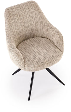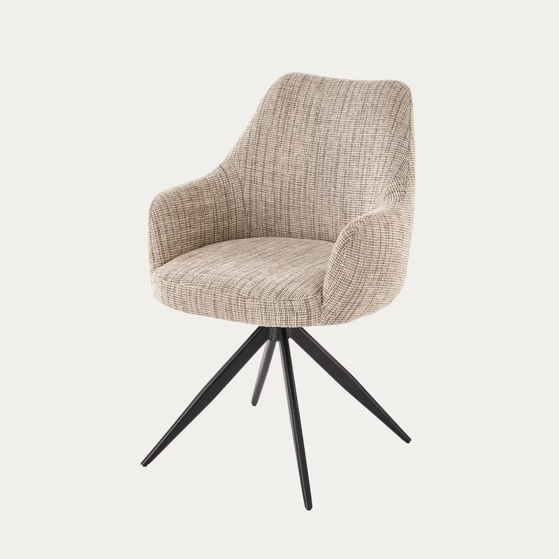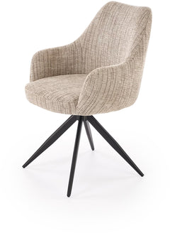 Olivia ruokatuoli tarjoaa miellyttävän istuinmukavuuden pehmeän beigeverhoilunsa ansiosta. Sen korkeaselkätuoli ja kaarevat käsinojat tukevat mukavasti istujaa. Tuoli pyörii 360 astetta.