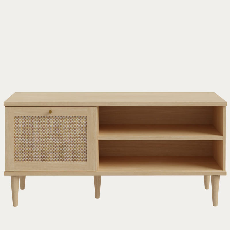 Paju tv-taso on kompakti ja ajaton tammi • rottinki -yhdistelmä, joka tarjoaa käytännöllistä säilytystilaa ja sopii pienempiin tiloihin.