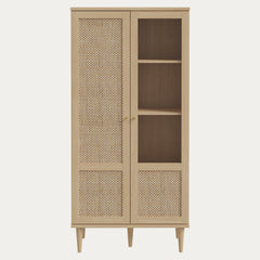 Tilava vitriini tammi • rottinki -yhdistelmässä, jossa kaunis rottinkikuviointi luo luonnonläheisen tunnelman kodin säilytykseen.