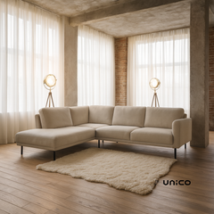 Unico Finlandin avokulmasohva tuo olohuoneeseen raikkaan ja modernin ilmeen, jossa yhdistyvät selkeä muotoilu, mukavuus ja käytännöllisyys. Sohvan ilmava rakenne ja sirot metallijalat antavat kokonaisuudelle keveyttä, joka sopii niin skandinaaviseen sisustukseen kuin minimalistisiin tiloihin.