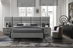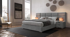Salma-sängynrunko harmaan sävyisenä tyylikkäällä pehmustetulla päädyllä tuo makuuhuoneeseen ajattoman ja rauhallisen ilmeen.